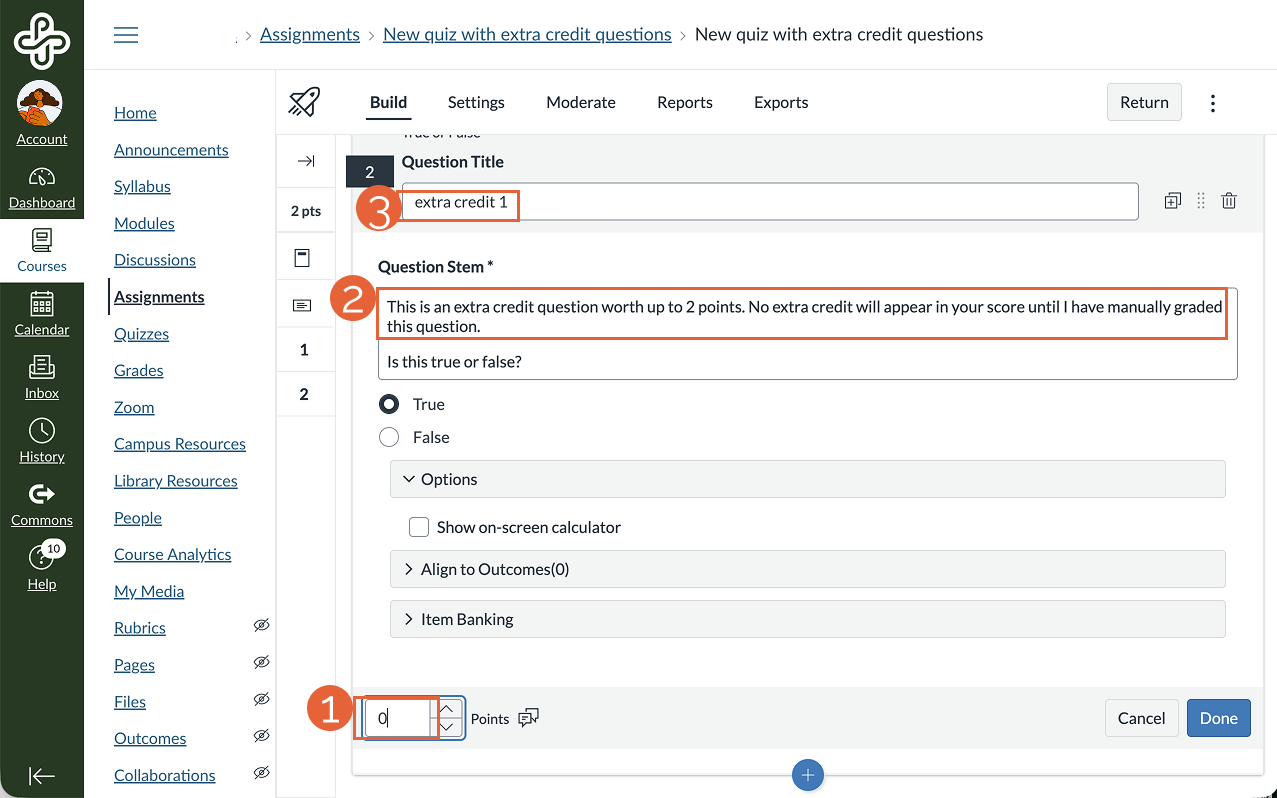 To create an extra credit question, set the question’s point value to zero. When you manually grade the question, any points assigned are added to the quiz total. The quiz score can exceed 100%. Once extra points are manually entered in SpeedGrader, the updated total automatically transfers to Grades.