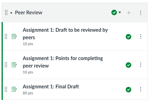 If you want to assign points for completing the peer review, you’ll need a third, no-submission assignment. Because you will need to enter these grades manually, you might consider keeping track of who completed peer reviews on a piece of paper as you go through the initial draft assignment.